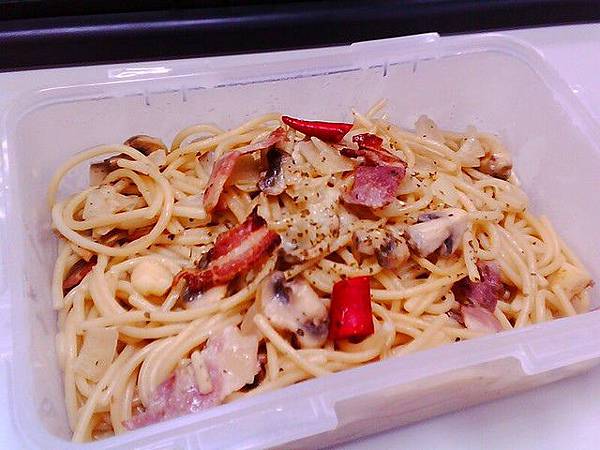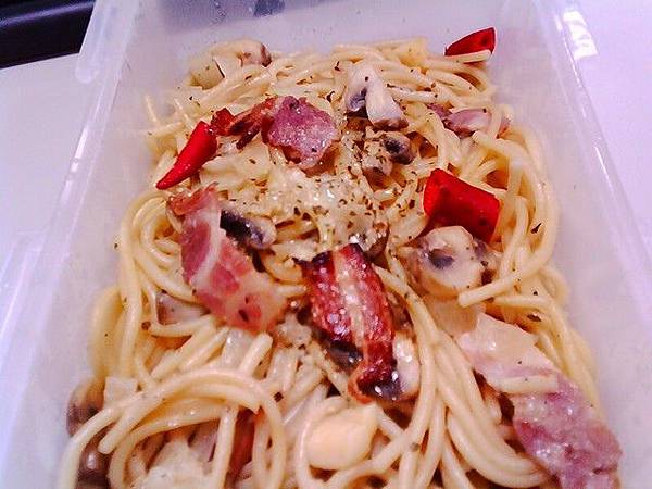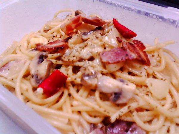 4.放入洋蔥及蒜頭、辣椒炒至洋蔥有點透明,加入磨菇跟煮好的義大利麵,翻炒後加入鮮奶到差不多可以蓋過麵條