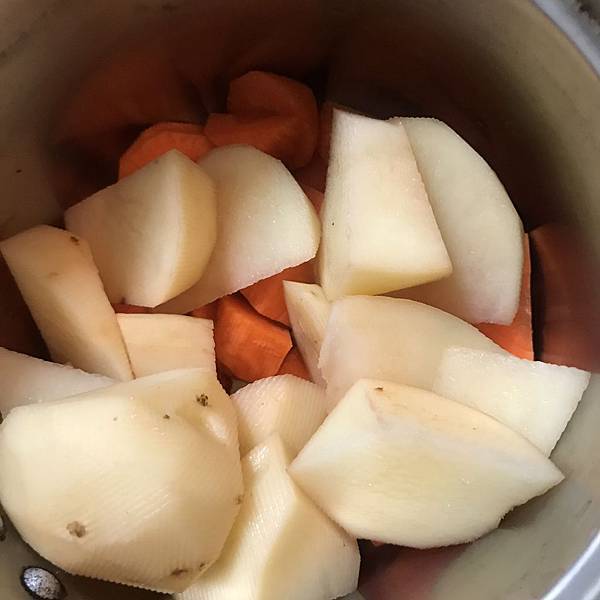 紅蘿蔔跟馬鈴薯去皮,切滾刀塊