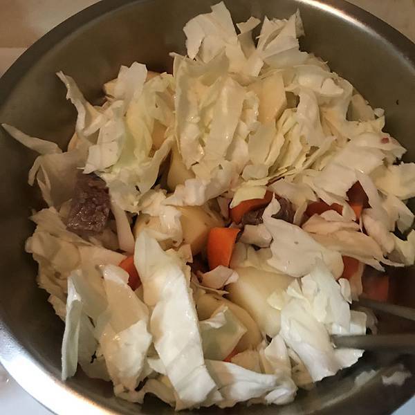 然後是丟入馬鈴薯、紅蘿蔔、高麗菜拌炒,但我不是用炒鍋,喇不動,所以嘛就全丟進去了。